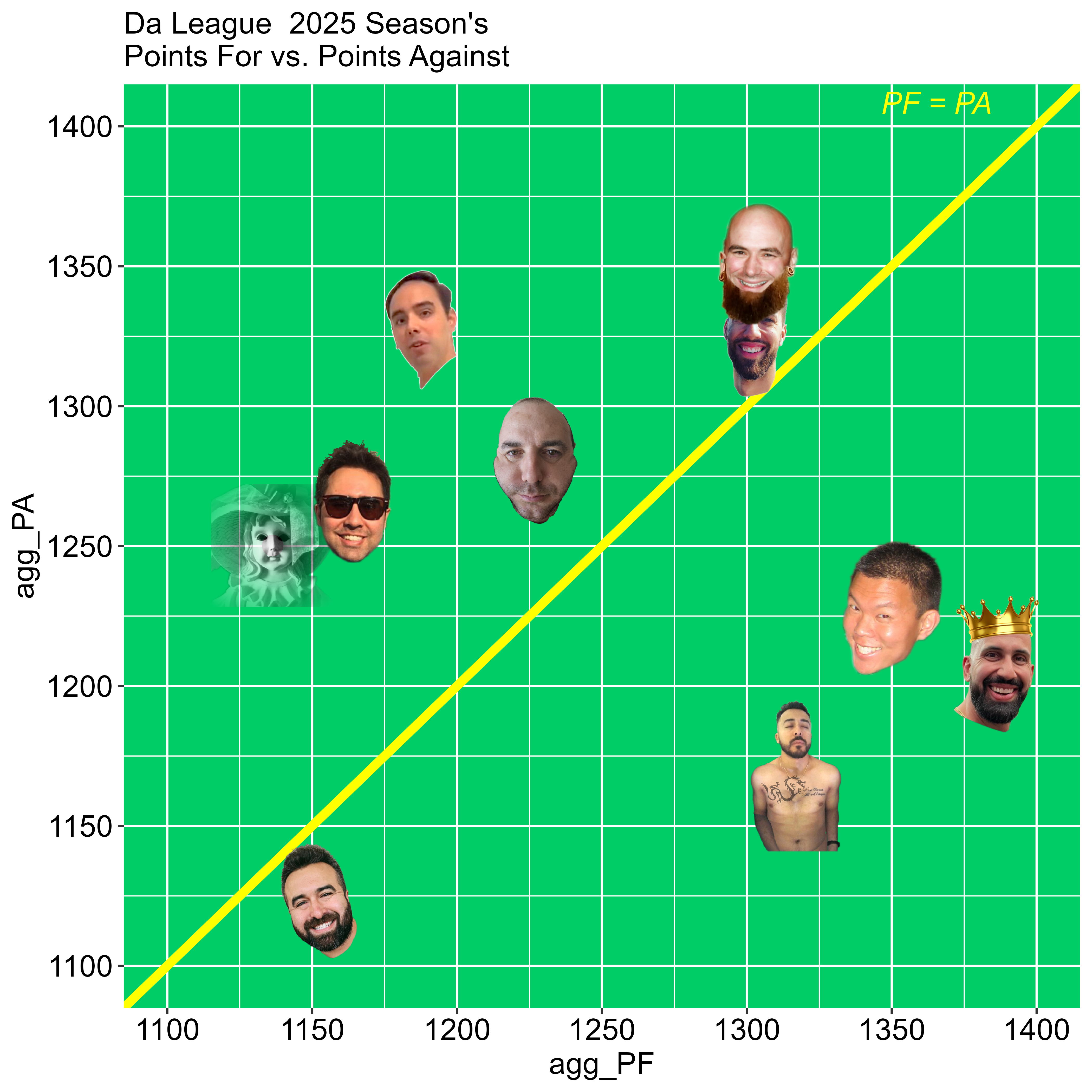I will include data visualizations for my fantasy football league here. I will probably use R and Shiny to make the visualizations reactive and a Python script will be used to scrape for pseudo real-time scores. For now, click on the static images to see them in full size: